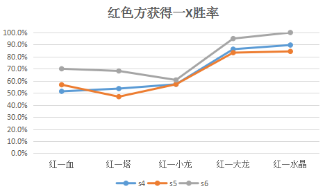 1. S6红色方拿下第一路水晶时胜率为100%。