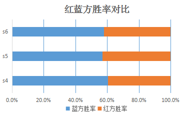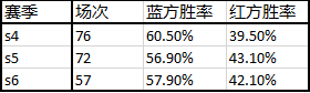 2、三个赛季的对比中,s5赛季是相对最均势的时期,蓝红两方的胜率比为56.9%:43.1%。