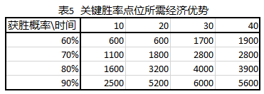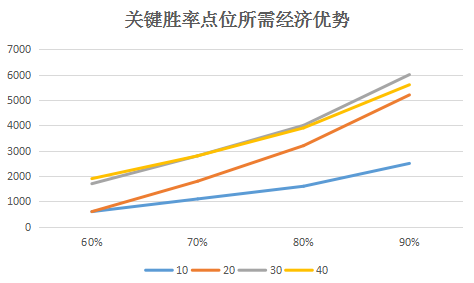 为了更直观的显示,笔者做了要达到60,70,80,90胜率时在不同时间点所需要的经济优势: