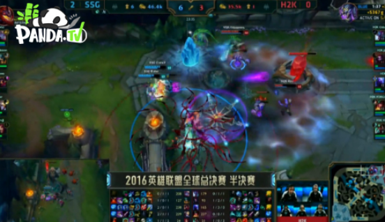 第一场开场不到一分钟,SSG豹女进入野区,被H2K下路两人配合打野合力击杀,H2K拿到最快一血。虽H2K前期人头领先,但经济未拉开距离,SSG在发育成型后,秒掉大龙一波带走了H2K。