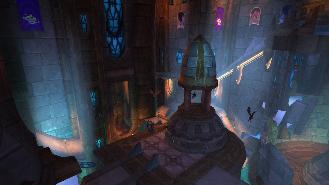 事实上,我们在这几张图里看到的“颠倒的卡拉赞”,其实是因为卡拉赞的顶部时空错乱,于扭曲虚空混合在了一起而导致的空间尺寸和方向的错乱。