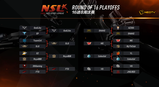至此,NSL《守望先锋》季前赛16进8的比赛已经全部结束,进入八强的战队分别为Godlike战队、SLG战队、Royal皇族战队、FTD战队、Snake战队、We战队、Cl战队及VG战队。接下来的八强赛将采取先抽签分组,再进行组内循环淘汰赛的形式进行,更多赛事信息请登录赛事官网查看://nsl.neotv.cn/
