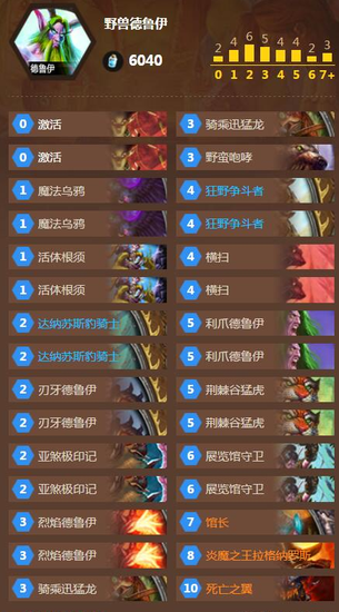野兽随从(14张):两张魔法乌鸦,两张刃牙德鲁伊,两张烈焰德鲁伊,两张骑乘迅猛龙,两张狂野争斗者,两张利爪德鲁伊,两张老虎。