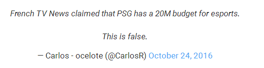 一个PSG发言人表示,队伍并没有投资2000万,而且这笔钱没有被投入到他们的LOL战队。