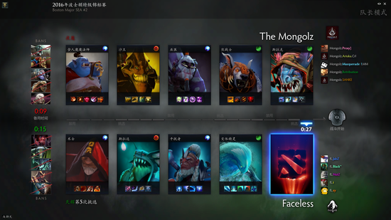BP阶段Faceless禁用了暗影恶魔、大地之灵、殁境神蚀者、沉默术士和半人猛犸,选择了术士、大鱼人、萨尔、水人和帕克五名英雄,先后手爆发AOE后期能力都非常不速,除了帕克看起来比较飘逸之外感觉和中国队阵容差不多。Mongolz队则BAN掉了不朽尸王、蝙蝠骑士、修补匠、小狗和卡尔,选择了蓝胖、沙王、巫医、拍拍熊和小鱼人,阵容近战较多、控制虽然足够但都是小控,适合在野外打遭遇战,团战要看拍拍和小鱼人的切入。