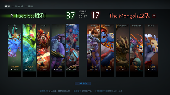 28分钟蒙古队小鱼人隐刀探明对手酱油位置,先手击杀Faceless两个酱油,术士在死之前交出了大招,算是死得其所,假面骑士反手一套秒掉对方两个酱油后,水人帕克和大鱼人把对面几个人全秀死了,Faceless依旧掌握巨大优势。到此时水人的经济开始逐渐拉开其他英雄,领先对手大哥6000经济。帕克和水人的高爆发让蒙古队酱油非常头疼,见光就死了。33分钟Faceless先手秒掉在高地下面收兵的沙王后,巫医也顺手交代了性命,假面骑士顺势上高,来回拉扯秒掉对手所有英雄,只剩一个小鱼人无力回天,小鱼人交出自己的性命后无奈打出GG,Faceless连续拿下了三场比赛的胜利。