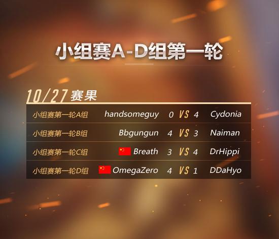 在27日进行的比赛中,出场的两名中方选手喜忧参半,位于C组的Breath三度领先被三度扳平最终遗憾掉入败者组,身处D组的OmegaZero则发挥出色,轻取韩国选手进入胜者组。另外两场比赛,来自加拿大的Cydonia以4:0的比分横扫韩国选手HandsomeGuy,美国选手Bbgungun以4:3的比分险胜此前在中欧对抗赛中有着不俗表现的Naiman。