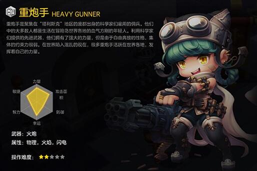 在冒险岛2中,重炮手50%的输出来自于操作,可开发的花样玩法技能很少,是高级副本的稀有职业之一,适合平时刷图偶尔要点输出高潮的玩家。