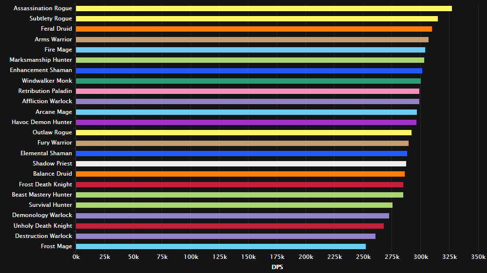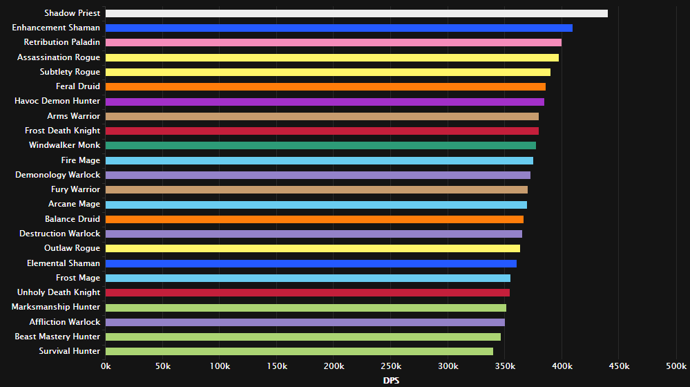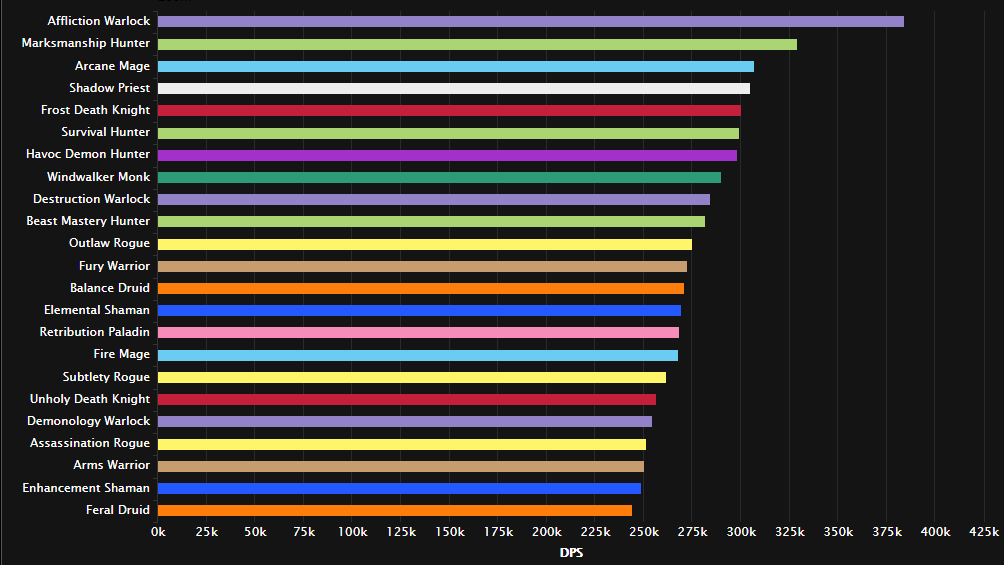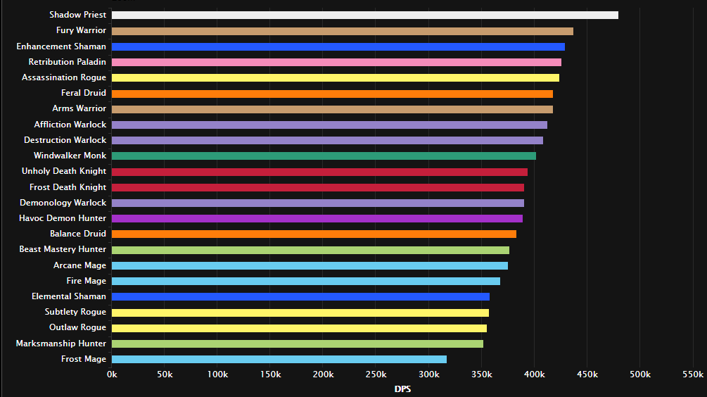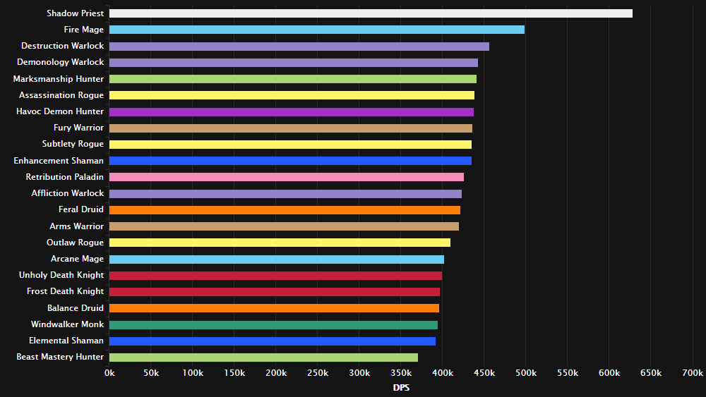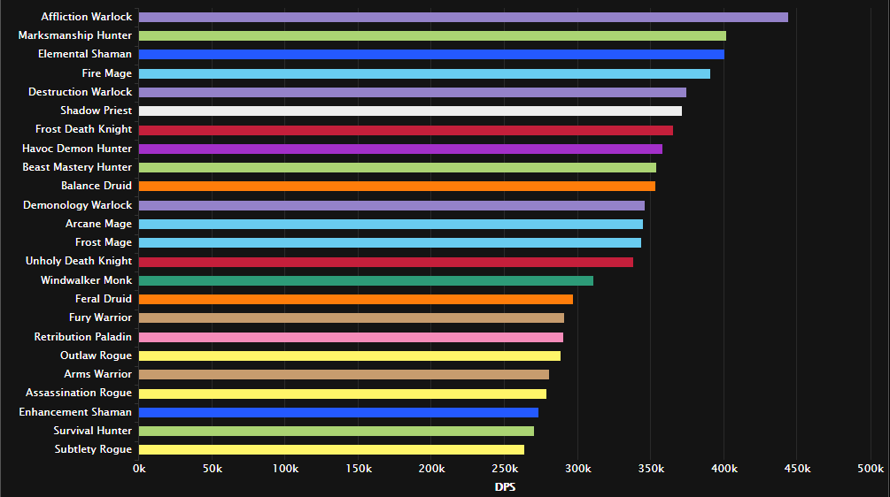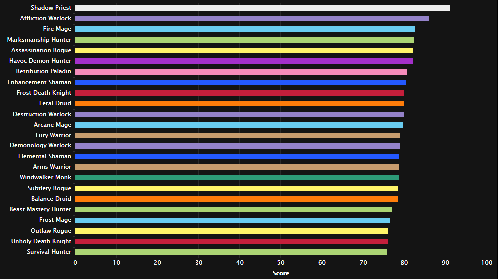 战斗时间短,还有少量时间的双目标,暗牧虽伤害被削,但仍然适合这种战斗。 紧接着的全是近战专精:增强萨/惩戒骑/刺杀贼/敏锐贼/野德/浩劫DH/武器战/冰DK。法师已哭晕在厕所。
