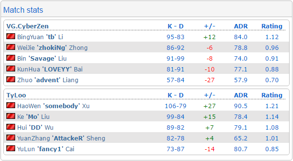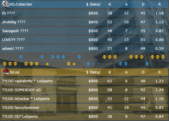 SOMEBODY在cobblestone上的发挥非常关键下半场手枪局SOMEBODY打掉两名对方的防守队员帮助TyLoo赢下手枪局,此后TyLoo的进攻变得一发不可收拾,他们在下半场连得7分取得8个赛点,VG虽然顽强地挽救了两个赛点,但TyLoo还是在第25局依靠DD的突破终结了比赛,2-1战胜VG后锁定了亚洲区第二个Major预选赛的名额。