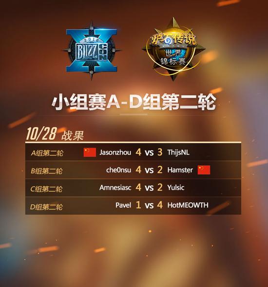 2016《炉石传说》世界锦标赛于10月28日进行了小组赛第二日的比赛,中国选手Jasonzhou力克ThijsNL进入A组胜者组,而哈姆士郎则掉入B组败者组。