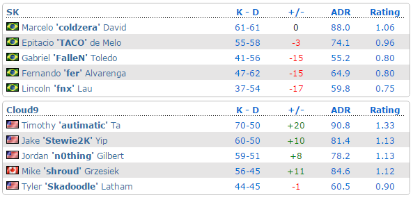 但易边之后的C9也同样在进攻端出现了问题,进攻失去体系的他们也被SK打的晕头转向,近期状态火热的TACO更是在残局中帮助队伍抢回数分,将比分强势追平;出现严重失误的C9最终只得依靠n0thing与autimatic的精彩发挥将比分扳平,拖入加时赛。遗憾的是加时开始后C9依旧作为进攻方开始,最终没能在做T的半场拿下足够多的分数,遗憾地以17-19输掉。