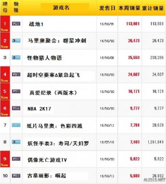 近日,日本上周(10月17日-23日)的游戏和主机销量统计数据公布,其中刚刚上市的EA旗下大作《战地1》仅三天的统计数量就达到了11万份,比其他游戏高出了一位数,甩出它们几条街!