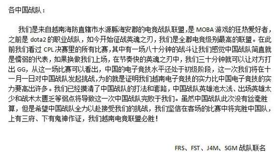 这翻译的还真是洋洋洒洒,不过从战书的字里行间里,我们看到了越南战队对自己的电子竞技水平谜之自信,此次越南战队挑战的项目是国产MOBA英魂之刃,这意思是捏柿子挑软的捏的节奏吗?这几支越南战队之前竟然还是DOTA2的职业战队,完全没听过呀。不过话说回来在《英魂之刃》中不乏WE、LGD、EHOME等大腿战队,估计这一次越南战队要吃瘪了。