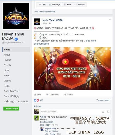 就在战书下达没多久,中国俱乐部好像是接受了越南战队的挑战,比赛时间定在了11月1日。此时小编默默打开了越南《英魂之刃》的FACEBOOK上静静浏览,发现了一些非常不友好的言论,比如