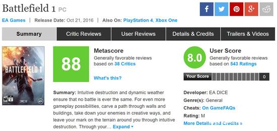 EA巨制《战地1(Battlefield 1)》发售好评如潮,其中还包括满分,不过日前MC网站评分却由90分削减为88分,因为加入最新收录评分5分,这个媒体就是之前评测《神秘海域4》4分的《华盛顿邮报》。