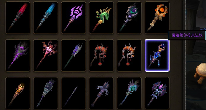 可以看到在幻化衣橱里面,已经有有了4.2橙杖的一阶段外观和诺达希尔的分枝和二阶段外观诺达希尔的符文法杖。同样的,橙斧和橙匕之前的外观也可以幻化了。