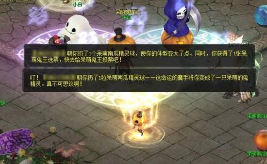 说明:装着可爱礼帽的精灵球。右键点击后,再选中一名冒险者,就可以将精灵球扔向对方啦——被砸中的“幸运儿”将有可能变成可爱的鬼精灵哦。 名称:呆萌南瓜精灵球