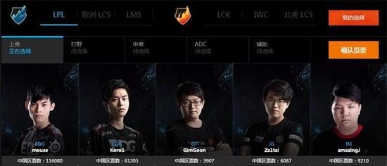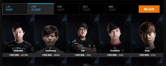 上单位置和打野位置的票数呈现了碾压的趋势:EDG上单Mouse 以及 EDG 打野Clearlove 以十万加票数遥遥领先。