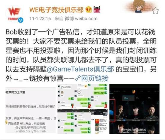 北京时间11月2日凌晨,WE官博发表了一篇微博呼吁粉丝:不用给我们的队员们刷票了,我们只想封闭训练,不想去全明星,要投票就投GT战队的选手吧。