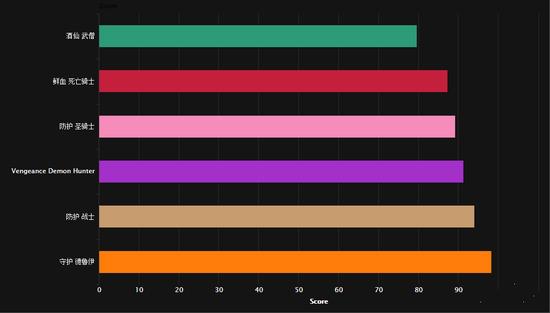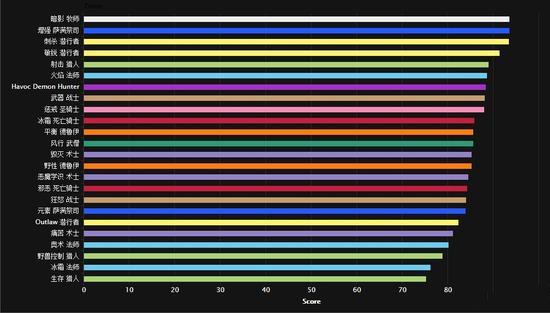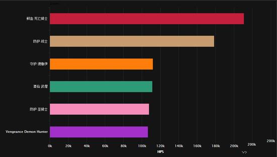 这是DPS职业在英雄翡翠梦魇中所有BOSS的综合表现。可以看出在恶魔猎手的恶魔之刃天赋改动过后,DPS有了明显的上升,勉强跻身第一梯队。冰霜DK也因为大幅度的BUFF提高了不少名次。然而暗牧依然登顶。
