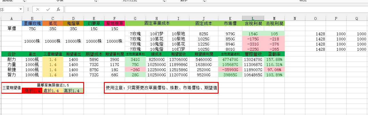 之前看到地精区有人分享,不是很完善。所以我做了图片中的计算表格。只做了合剂部分,有心人可以继续做药水部分。