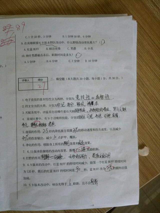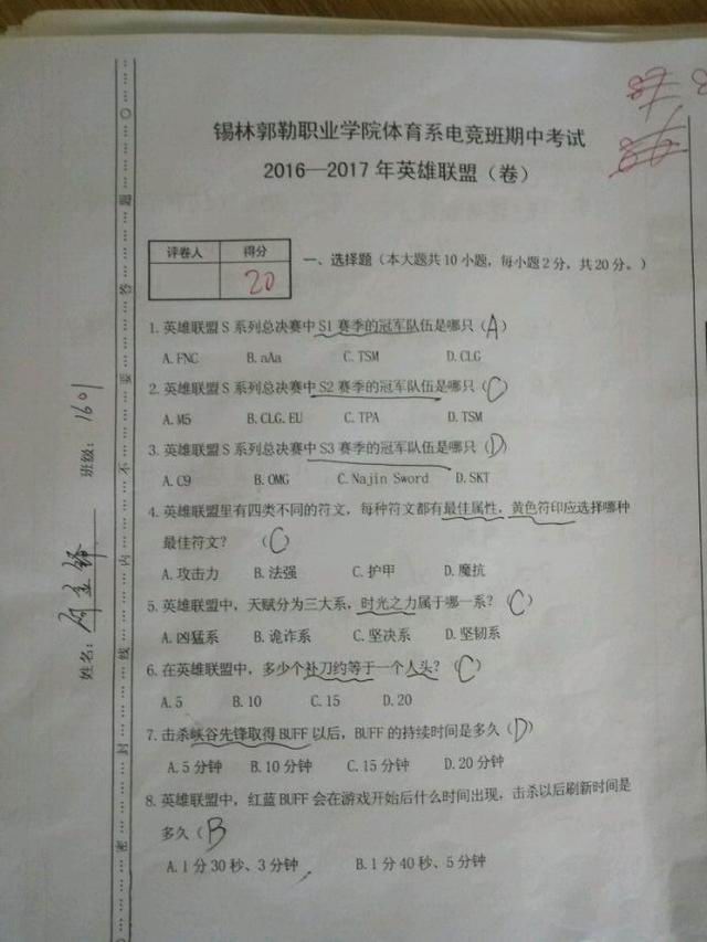 从试卷可以看出,期中考试为2016-2017英雄联盟(卷),选择题基本都是英雄联盟里面的基础知识,以及S系总决赛常识题目。试卷分为选择题,填空题和简答题三部分。