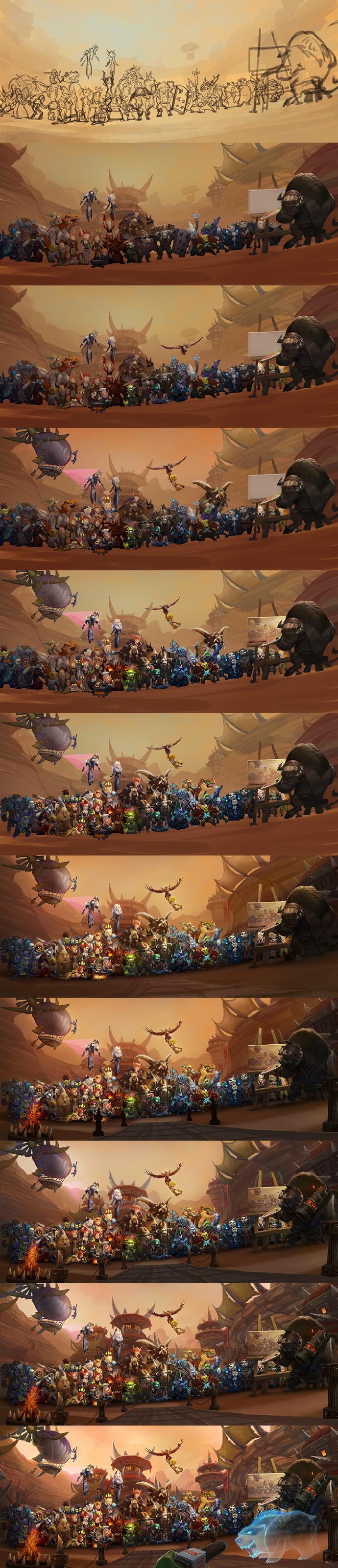 《Our Family of WOW》这张画更奇葩,我从2014年底开始,缠缠绵绵画了快两年才完成,如今可以重见天日了,感谢“艾泽拉斯深度旅行团”的小伙伴儿们有这耐心等到我画完,