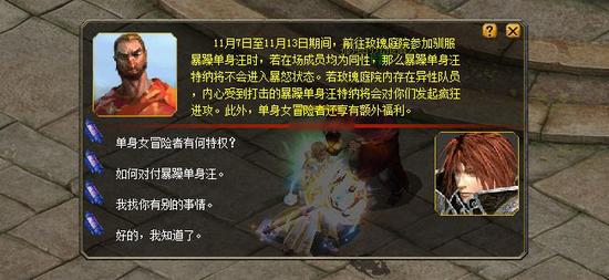 11月7日至11月13日,孤独的光棍猎人卡雷(353, 380)将会来到卡诺萨城请求冒险者们前往玫瑰庭院寻回暴躁单身汪特纳。 活动期间,所有等级达到90级的冒险者每天均有3次参与驯服暴躁单身汪的机会。 冒险者可以选择独自前往驯服暴躁单身汪,也可以选择组队前往面对挑战。若女性冒险者独自进入玫瑰庭院,暴躁单身汪在生命值降低到50%之前,将不会对其发动攻击。而异性组队进入玫瑰庭院,则会面对暴怒状态下的暴躁单身汪,不过击败暴怒的暴躁单身汪可以获得双倍奖励。 所有进入玫瑰庭院的冒险者均可获得1份暖心狗粮,这个神秘食物可以令暴躁单身汪在短时间内无法发动攻击。 击败暴躁单身汪即可获得南瓜币。每位冒险者每天最多可领取2次奖励。 |