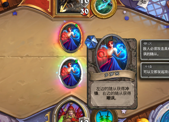 小编打了两局,因为有冲锋和嘲讽的BUFF,所以随从可以选择圣盾随从,无论解场还是当墙都能保证在交换随从的时候赚到。