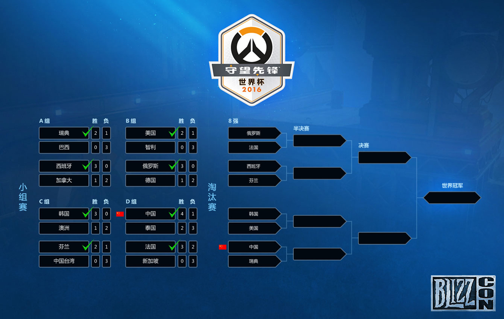 2016暴雪嘉年华开赛周的比赛刚刚落幕,从全球超过50个国家和地区中选拔出的16支队伍在《守望先锋》世界杯的赛场上展示了各自的实力。经过连续3天紧张激烈的比赛后,中国队不负众望,在小组加赛中击败泰国队与法国队杀出重围,以D组第一的身份晋级8强。至此,首届《守望先锋》世界杯的8强队伍已经全部诞生,他们分别是:中国、俄罗斯、法国、西班牙、芬兰、韩国、美国以及瑞典。