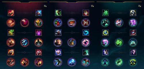 所有天赋树都采用通用的框架结构。随着天赋树一层层递进,越高级的天赋就越对应了特定的战术打法,对应关系体现在这些天赋带来的收益,以及收益最大化所需要的其他东西。初级天赋通常都是以对线或者清野作为考虑因素的,而高级天赋的效果则会提供更多成长性。