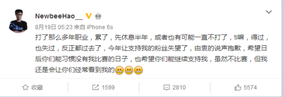TI6之后Newbee经过大洗牌三名核心成员HAO。MU、CHUAN退出,HAO发布微博宣布:打了这么多年职业累了先休息半年。