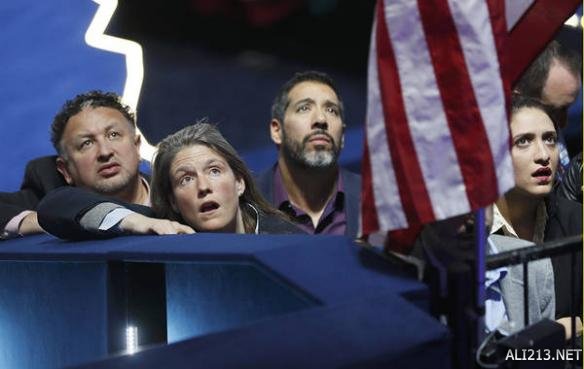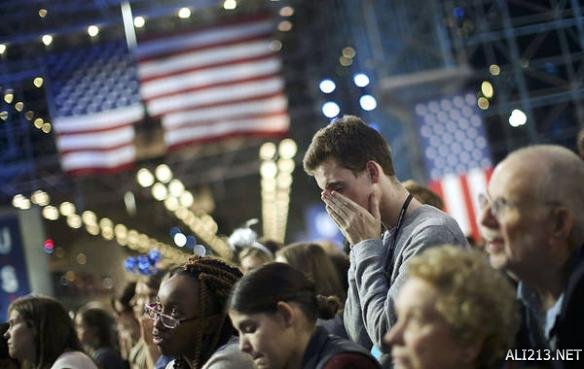 支持希拉里的集会上,人们看到竞选结果一脸惊愕,说不出话,黯然神伤。