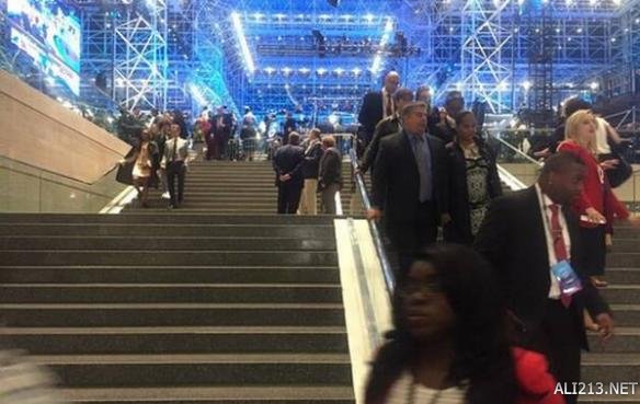 希拉里的选后集会,一旦获胜这个舞台将立即搭建起来,举行庆祝,但现在不少支持者提前离开。