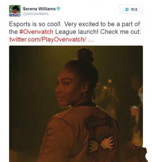 美国网球名将塞雷娜·威廉姆斯(小威廉姆斯)在推特上发文支持《守望先锋》,表示:“电子竞技真的很酷!参加守望先锋职业联赛发布非常激动!在这里来找我:(链接)”。该推特附带链接跳转到暴雪《守望先锋》官方推特的职业联赛宣传推文。