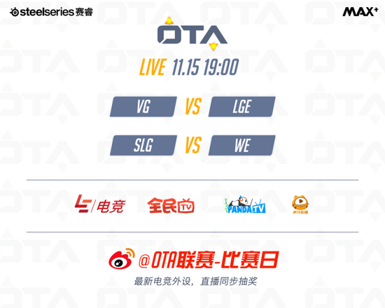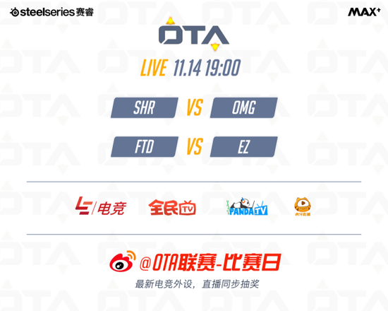 赛睿OTA第五赛季第四周,即最后冲刺冠军的三个比赛日中,首先将为观众带来的是11月14日周一19:00点SHR皇族对阵OMG、FTD对阵Ez的两场1/4决赛,周二19:00点则直播另外半区,VG对阵LGE、SLG的两场1/4决赛。周三晚上19:00对两场半决赛及决赛进行直播,敬请关注主办方旋风比赛通过乐视电竞演播室,在乐视电竞,全民TV,熊猫TV,虎牙直播为您带来的三天比赛节目内容!