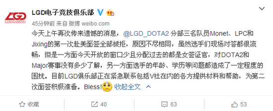 今天上午再次传来遗憾的消息,@LGD_DOTA2 分部三名队员Monet、LPC和Jixing的第一次赴美面签全部被拒,原因不尽相同,虽然选手们现场对答都很流畅,但是一方面今天开放的窗口少且分配过去的都是女签证官,对DOTA2和Major赛事没有多少了解,另一方面选手的年龄、学历等问题都造成了一定程度的困扰。目前LGD俱乐部正在紧急联系包括V社在内的各方提供材料和帮助,为第二次面签积极准备。Bless!