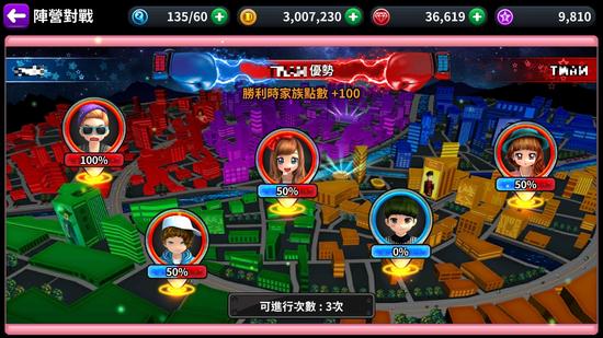 当然,期待以久的‘家族阵营对战’正式与玩家们见面,每周为期六天系统会随机将全伺服器家族进行红、蓝队一对一的配对。每位家族成员每天皆有三次参加阵营对战的机会,从五个阵营领地都有舞功高强的NPC等待玩家挑战,当击败该NPC时即能得到‘阵营点数’、‘金币’、‘F金币’、‘家族点数’。每周日为休息结算日来盘点最终红、蓝家族阵营的战斗结果,最终获胜的家族可以获得大量‘家族点数’以影响家族排行名次高低。