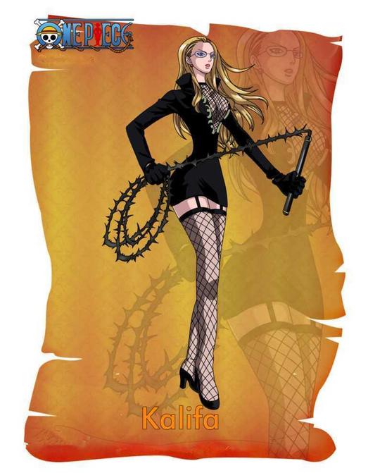 卡莉法,CP9中唯一的女性,是超人系“泡泡果实”能力者,凡是被手碰到过的东西变得光滑无比,可使人变得光滑,无法站立、攻击减半。卡莉法留着金色长发,佩戴有色镜片的眼镜,穿着黑色内衣丝袜裙和黑色手套,喜欢用手托眼镜,惯用的武器是上面带有棘刺的长鞭。