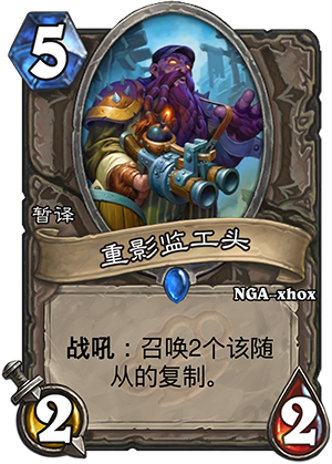 重影监工头,召唤2个该随从的复制。5费3个22,这张牌让我想起战士的缚灵术。但有一点不同是可以配合之前的BUFF手牌的卡。比如5费3个33、5费3个44这就厉害了。
