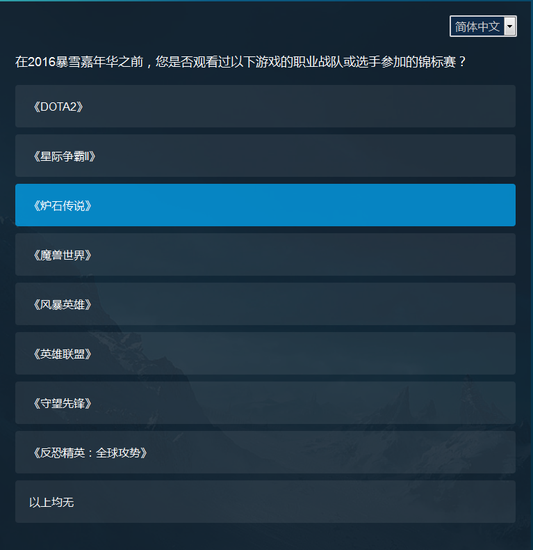 前面的问题都是铺垫,整个调查问卷估计只有这个才是爸爸最想知道的!里面的游戏设计暴雪系的已经CS、LOL、TOTA2。但是为什么没有war3??