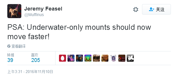 暗月马戏团活动上线后,玩家们似乎没那么感冒,并没有那么多人去获取这只新水下坐骑……于是宠物和坐骑设计师发了推。