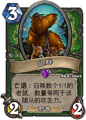 鼠群:亡语,召唤数个1/1的老鼠,数量等同于该随从的攻击力。参考4费的寄生恶狼,这张牌身材不亏,但问题是猎人3费有动物伙伴,鹰角弓,杀戮这些卡,所以还是很难进构筑。