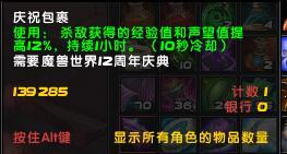 [庆祝包裹]:使用:杀敌获得的经验值和声望值提高12%,持续1小时。(10秒冷却)。<需要魔兽世界12周年>