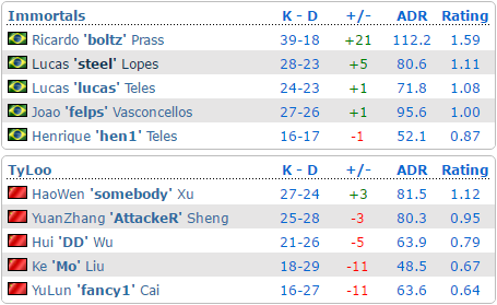 boltz状态爆表最关键的第29局TYLOO依靠一个B区的闪光成功击杀两名对方B区防守队员,率先拿到赛点,赛点局TYLOO出现失误被对手率先打掉两人,双方进入加时赛。加时赛上半场Immortals取得2分,下半场TYLOO率先守下第一分,但第二局出现了严重失误,Mo在A二楼被对手打了一个背身,防守阵型被破坏的TYLOO无从招架,送出赛点的同时自己的经济也崩溃了。Immortals没有浪费赛点,以19-17的比分战胜TYLOO。