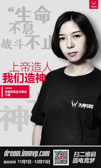 2016年11月,小楼加入了大神工厂项目作为女导师,希望帮助更多热爱电竞的人找到他们的方向,利用自己的资源和经验帮他们实现梦想。相信小楼的坚持、努力和一路以来的经验都能帮助那些希望进入电竞行业的人们去找到自己的方向和方法。梦想进入电竞行业的妹子,温柔、才貌双全的小楼在大神工厂中更是能带给你不同于男导师的教导。“不忘初心,方得始终。”如果保持着自己坚定的信念不断前进,即使荆棘满途,但坚定的走下去一定会离自己的梦想更近一步。“生命不息,战斗不止”,只要鉴定梦想并不断前进,女生一样可以做好电竞!
