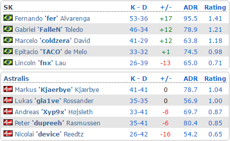 第二场比赛在丹麦人选择的mirage上进行,SK上半场先做CT上来就取得4-0的开局,Astralis连得4分将比分追平。但此后Astralis陷入了崩盘,SK连得7分,以11-4的比分结束了上半场比赛。