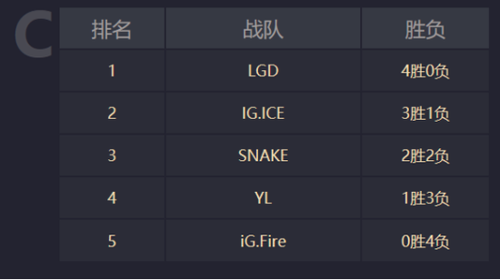 由恬趣冠名赞助、熊猫直播主办的先锋杯第三赛季C组在紧张的氛围中收官,虽然夺冠热门IG.FIRE因特殊原因弃权了本届比赛,但丝毫不影响C组激烈的争夺。老牌劲旅LGD在C组的争夺中4战全胜强势晋级淘汰赛,而IG.ICE虽然在首日负于LGD,但随后连取SNAKE与YL保住小组第二入围淘汰赛,恭喜他们!