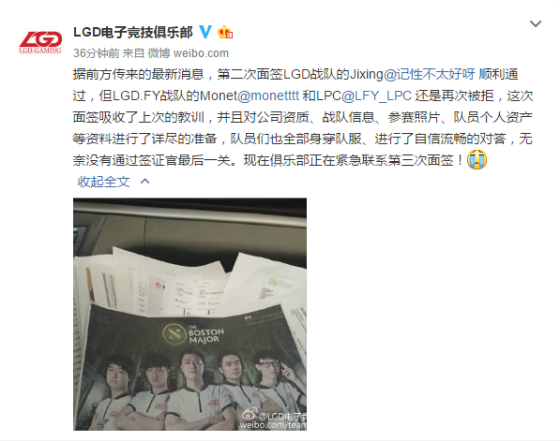 据前方传来的最新消息,第二次面签LGD战队的Jixing顺利通过,但LGD.FY战队的Monet和LPC还是再次被拒,这次面签吸收了上次的教训,并且对公司资质、战队信息、参赛照片、队员个人资产等资料进行了详尽的准备,队员们也全部身穿队服、进行了自信流畅的对答,无奈没有通过签证官最后一关。现在俱乐部正在紧急联系第三次面签!